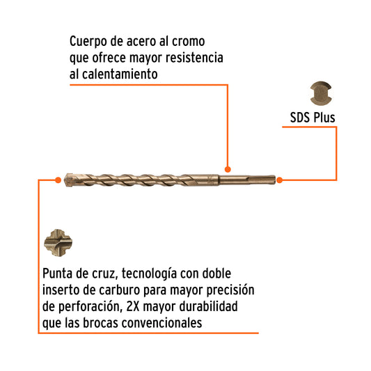 Proveedor:TruperBroca SDS Plus 25 x 460 mm, Truper Caja con 5, 101211Punta de cruz, tecnología con doble inserto de carburo para mayor precisión de perforación, 2X mayor durabilidad que las brocas...