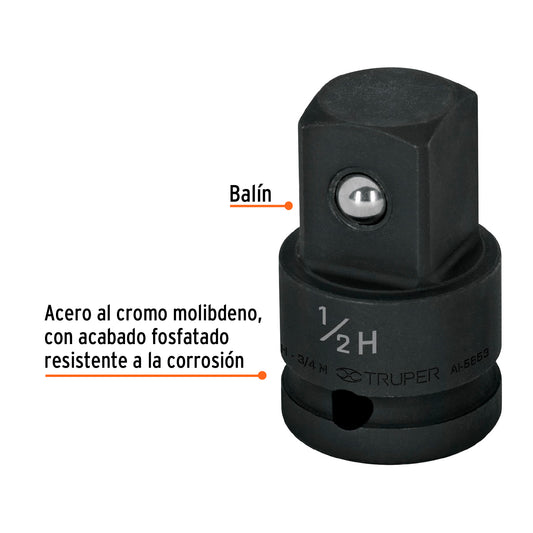 Proveedor:TruperAdaptador de impacto 1/2' (H) x 3/4' (M), Truper Caja con 6, 100907Fabricado en acero al cromo molibdeno con acabado fosfatado resistente a la corrosión Medida marcada para fácil identificación Ideal para herramientas...