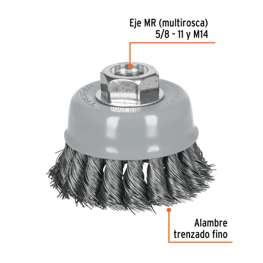Proveedor:TruperCarda copa 5' alambre trenzado grueso, Multi-rosca, Truper Caja con 4, 100856Fabricada en acero al carbono Acabado áspero Multi-rosca 5/8"-11 y M14 compatible con otras marcas del mercado y con esmeriladoras Truper®...