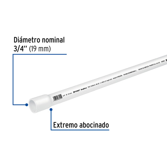 Proveedor:FosetTubo de 3 m de PVC de 3/4' hidráulico RD 26, Foset Caja con 5, 40082Cuerpo de PVC (Policloruro de vinilo) cédula 40, resistente a la corrosión, oxidación e incrustaciones y a fracturas por impacto No...