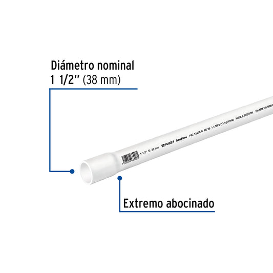 Proveedor:FosetTubo de 3 m de PVC de 1-1/2' hidráulico RD 26, Foset Caja con 5, 40085Cuerpo de PVC (Policloruro de vinilo) cédula 40, resistente a la corrosión, oxidación e incrustaciones y a fracturas por impacto No...