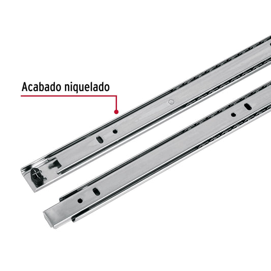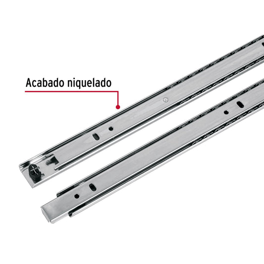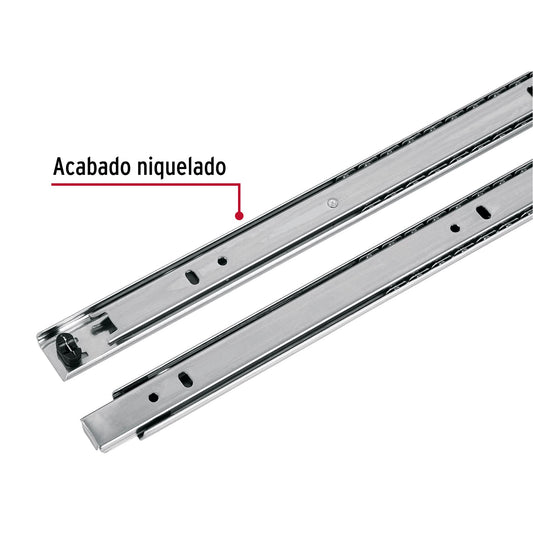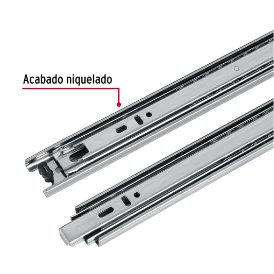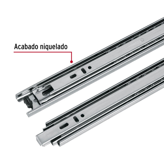 Proveedor:HermexBolsa con 2 correderas extensión 50 cm p/cajón, ancho 3.5 cm Caja con 4, 43288Fabricada en acero con acabado niquelado Sistema de balines para suave operación Topes de retención para cajón Para escritorios, muebles y armarios...