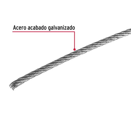 Proveedor:FieroMetro de cable flexible 1/8' de acero 7x19 hilos, 75 m Caja con 75, 44211Fabricados en acero acabado galvanizado Torcido regular *No sobrepase la capacidad marcada