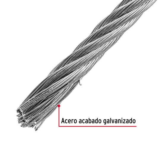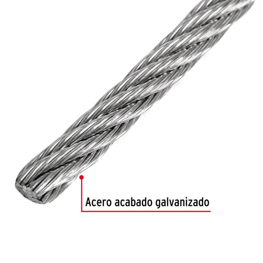 Proveedor:FieroMetro de cable flexible 1/4' de acero 7x19 hilos, 75 m Caja con 75, 44213Fabricado en acero con acabado galvanizado Torcido regular *No sobrepase la capacidad marcada