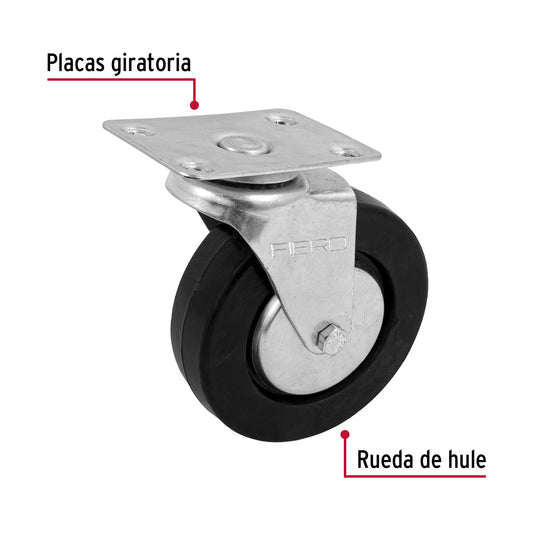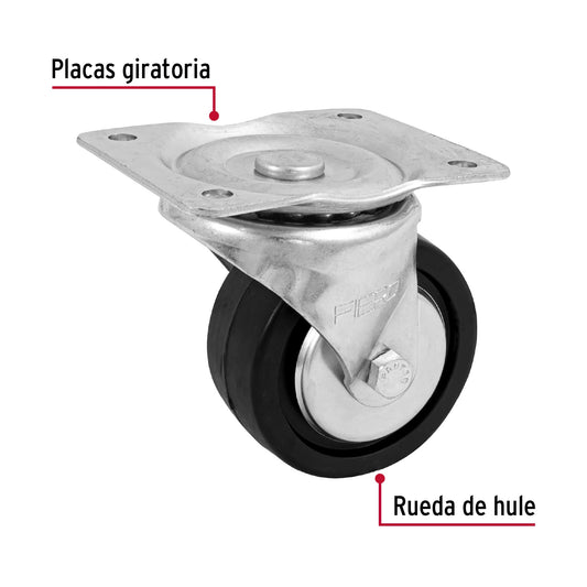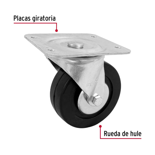 Proveedor:FieroRodaja hule 4', placa giratoria con balero, carga 100 kg Caja con 4, 48613Rueda de hule con balero y placa de acero con acabado galvanizado Sistema de fijación con placa giratoria Amortigua golpes...