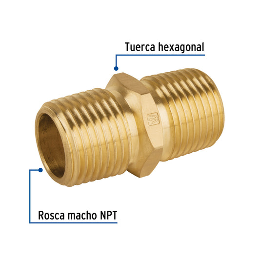 Proveedor:FosetNiple unión NPT de latón, 1/2' con tuerca hexagonal, Foset Caja con 10, 48499Fabricado en latón para máxima duración Roscas macho NPT Tuerca hexagonal Para gas L.P. y natural Fácil instalación