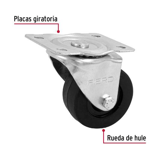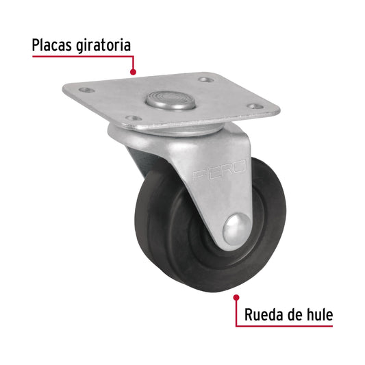 Proveedor:FieroRodaja hule 2', placa giratoria con buje, carga 25 kg Caja con 6, 48604Rueda de hule con buje y placa de acero con acabado galvanizado Sistema de fijación con placa giratoria Amortigua golpes y vibraciones Silenciosas Para...