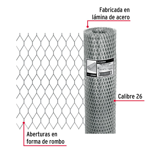 Proveedor:FieroRollo malla plafón 0.90 x 22m cal.26, abertura 10x25mm, 8kg, 44980Malla de lámina de acero con acabado galvanizado, resistente a la corrosión Ideal para techos, muros, cielos y paredes falsas,...