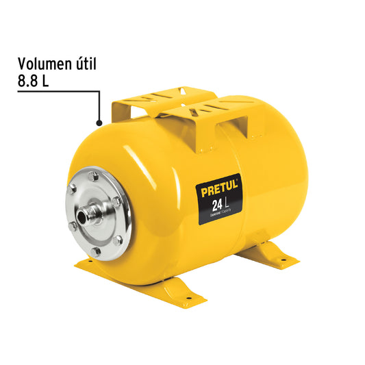 Proveedor:PretulTanque hidroneumático horizontal, 24 litros, Pretul, 27039Volumen útil: 8.8 L Presión máxima de trabajo: 60 psi Membrana de hule natural