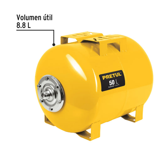 Proveedor:PretulTanque hidroneumático horizontal, 50 litros, Pretul, 27041Volumen útil: 18 L Presión máxima de trabajo: 60 psi Membrana de hule natural