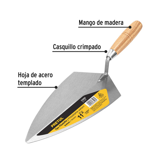 Proveedor:PretulCuchara para albañil 11' tipo Filadelfia, Pretul Caja con 6, 21055Hoja de acero templado que proporciona mayor resistencia al desgaste Mango de madera pulido y laqueado Ensamble reforzado de mango...