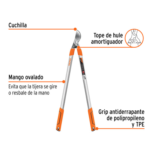 Proveedor:ExpertTijera para ramas 80cm,uso rudo,mgos de madera,TRUPER EXPERT, 18400Cabeza forjada en acero con encabado de doble tornillo Hoja con doble filo rectificado Mangos de madera