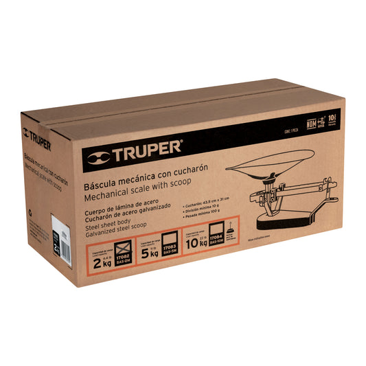 Proveedor:TruperBáscula capacidad 5 kg mecánica con cucharón, Truper, 17083Cuerpo y pilones de acero Cucharón de lámina de acero galvanizado Regletas fabricadas de aluminio Para uso comercial