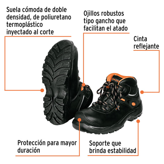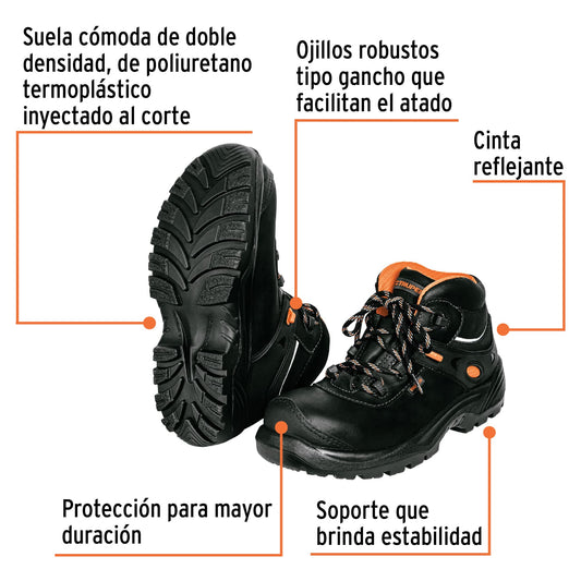 Proveedor:TruperBota de seguridad negra, #25 dieléctrica antifatiga, Truper, 15479Corte de piel de ganado vacuno Forro textil Plantillas que absorbe el impacto con perforaciones de transpiración Suela cómoda de doble densidad de...