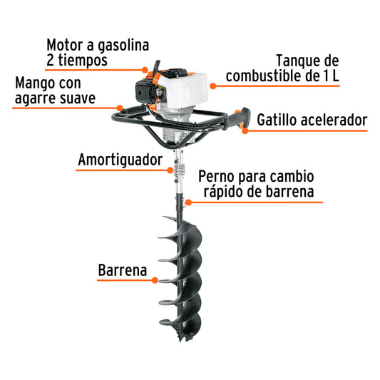 Proveedor:TruperAhoyadora / motoperforadora a gasolina 52cc, Truper, 103204Motor de 1.9 HP a 2 tiempos, requiere mezcla de aceite y gasolina 1 L de capacidad del tanque de...