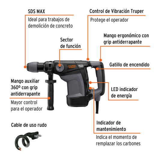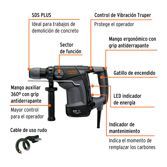 Proveedor:ExpertRotomartillo SDS Plus 4 Joules, 1000W, TRUPER EXPERT, 101220Motor de 1000 W con potencia suficiente para trabajos de alto rendimiento 4 Joules de energía de impacto que ofrecen...