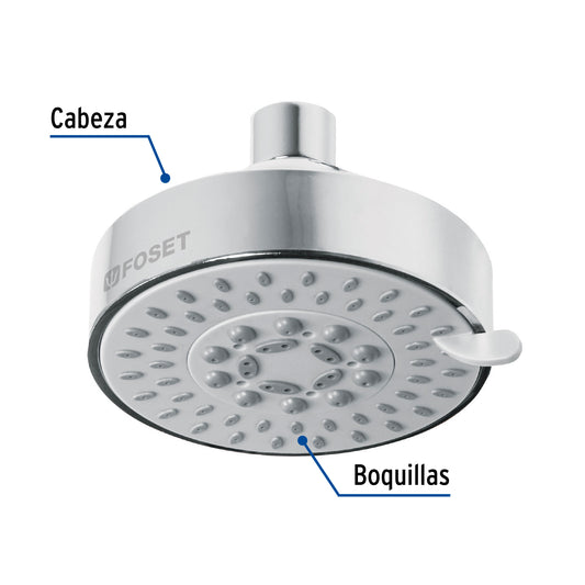 Proveedor:FosetRegadera cromo 4'con 5 funciones, sin brazo, Foset Element Caja con 2, 45169Cabeza de ABS Para mayor flujo de agua se puede retirar el reductor 5 Funciones lluvia, masaje, bruma, lluvia-masaje, lluvia-bruma...