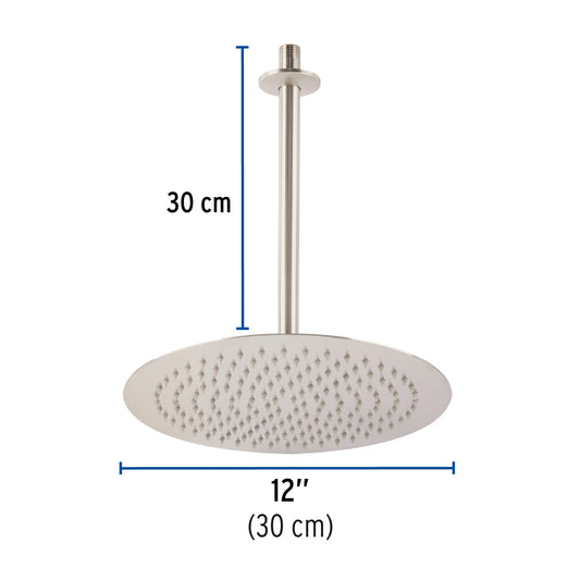 Proveedor:FosetRegadera satín 12' plato redondo delgado con brazo, Riviera, 45080Cabeza de acero inoxidable Incluye brazo de 30 cm para techo y chapetón de latón Para mayor flujo de agua...