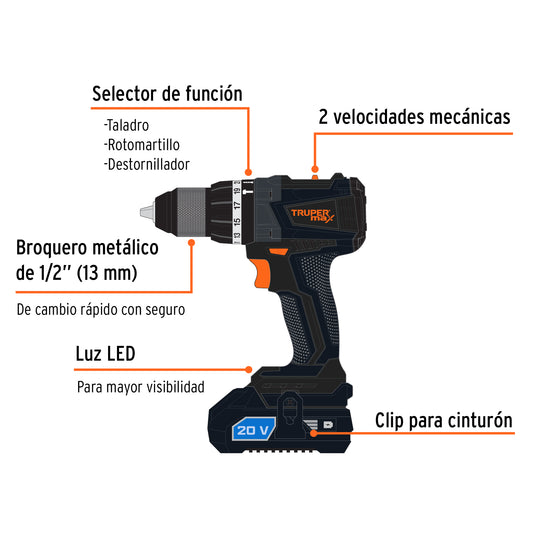 Proveedor:ExpertRotomartillo inalámbrico 1/2', 20V, sin carbones, TRUPER MAX, 101453