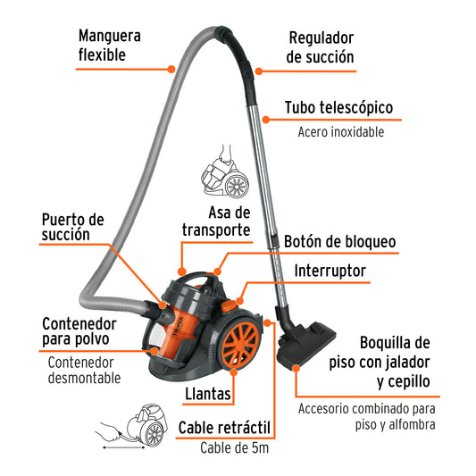 Proveedor:TruperAspiradora canister 1.2 L, Truper, 103159Motor de 1200 W para trabajos exigentes Manguera flexible con regulador de succión Llantas que no dañan los pisos Filtro...