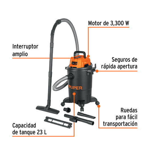 Proveedor:TruperAspiradora de sólidos y líquidos, 6 gal, plástica, negra, 102964Motor de 4.5 HP Capacidad del tanque 6 gal (23 L) Cable de alimentación 3.6 m Aspira líquidos y sólidos...