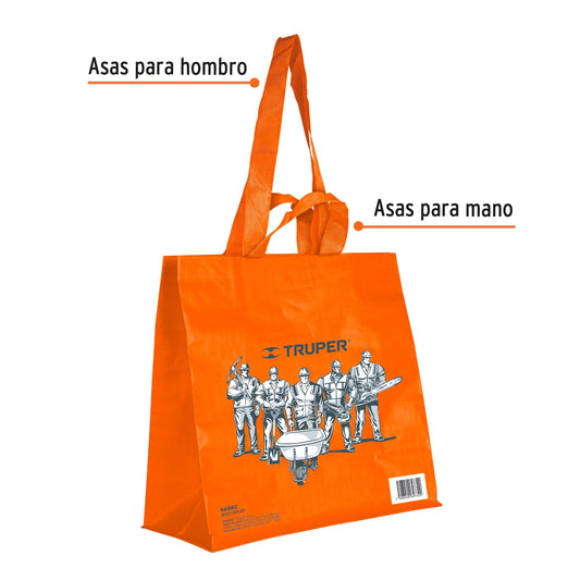 Proveedor:TruperBolsa ecológica naranja de 40 x 40 cm, Truper Caja con 100, 66082Fabricada en fibras de polipropileno Asas para hombro y mano Logotipo impreso Resistente y fácil de transportar