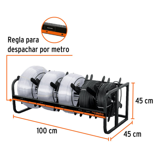 Proveedor:TruperRack para manguera y tubo flexible, Truper, 51576Fabricado en acero con recubrimiento de pintura color negra Se monta sobre el piso y no requiere fijación a la...