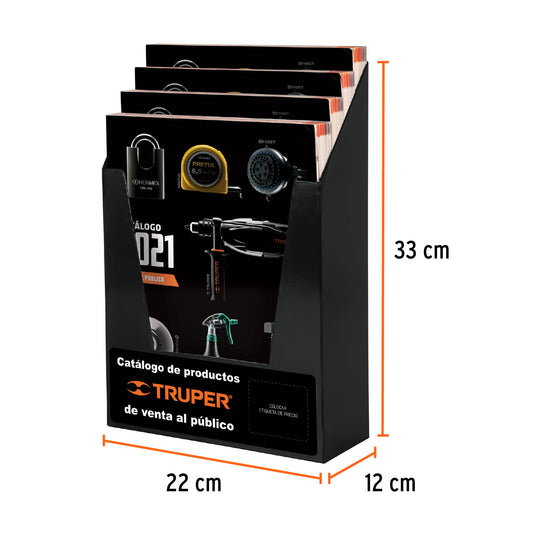 Proveedor:TruperRack para venta de catálogos en mostrador, Truper, 53004Barrenos para fijación en pared Capacidad para 4 catálogos Para mostrador o pared Catálogos no incluídos