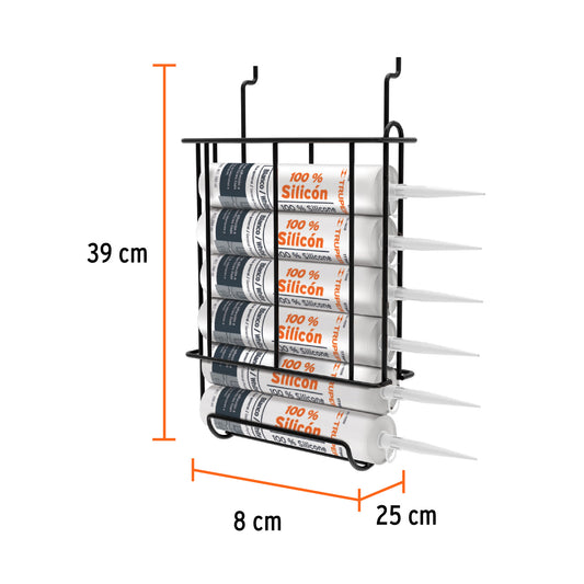 Proveedor:TruperRack para silicones, Truper, 50340Fabricado en acero con recubrimiento de pintura color negra Para exhibir 6 silicones aprovechando al máximo los espacios Para panel...