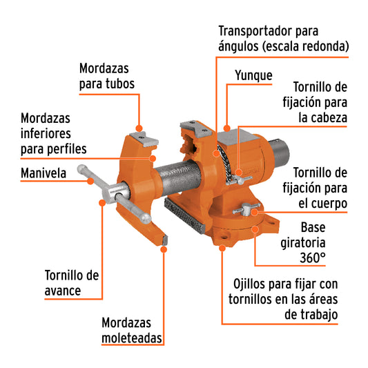 Proveedor:TruperTornillo de banco 5' multipropósito de hierro dúctil, Truper, 103643Cuerpo de hierro dúctil nodular de alta resistencia Mordazas de acero moleteado para un mejor agarre y mordazas para tubos...