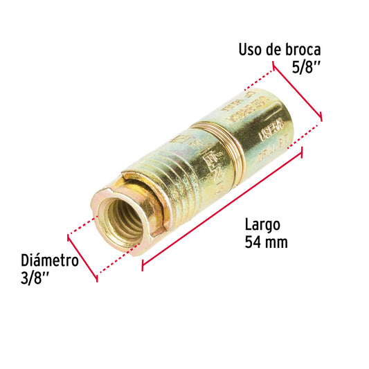 Proveedor:Fierotaquetes expansivos de 3/8' sin tornillo, Fiero Caja con 50, 47367Cuerpo metálico con anillo de retención de acero Taquete montado Para fijar en concreto