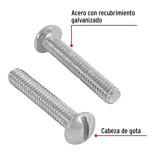Proveedor:FieroBolsa con 80 tornillos 1/4 'x 1-1/2' tipo estufa, Fiero Caja con 6, 44628Fabricados en acero con recubrimiento galvanizado Cabeza de gota Entrada para desarmador plano