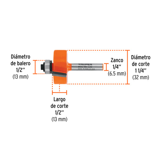 Proveedor:TruperBroca para router, redondeado, 1-1/4' con balero, Truper Caja con 3, 11470Cuerpo de acero al cromo y cuchilla de carburo de tungsteno Guía de balero que facilita el recorrido en bordes...