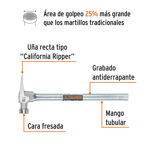 Proveedor:TruperMartillo tubular 16 oz uña California Ripper, cara fresada Caja con 4, 10643Cabeza de acero con área de golpe 25% más grande que los martillos tradicionales Mango tubular para trabajo pesado con...