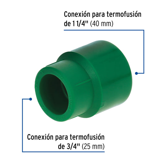Proveedor:FosetReducción de PPR 1-1/4' x 1', Foset Caja con 4, 45469Cuerpo de PPR (Polipropileno Copolímero Random) Para unir por termofusión Resistente a la corrosión, oxidación, incrustaciones y a los rayos...