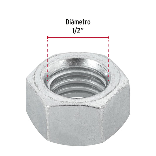 Proveedor:FieroBolsa con 50 tuercas 1/2' hexagonales de acero galvanizado Caja con 6, 44552Fabricadas en acero con recubrimiento galvanizado La medida corresponde al tamaño del tornillo que se acopla Permiten sujetar y fijar...