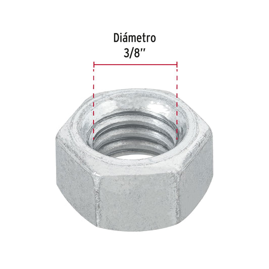 Proveedor:FieroBlíster con 12 tuercas 3/8' hex de acero galvanizado, Fiero Caja con 12, 40757Fabricadas en acero con recubrimiento galvanizado La medida corresponde al tamaño del tornillo que se acopla Permiten sujetar y fijar...