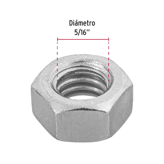 Proveedor:FieroBolsa con 150 tuercas 5/16' hexagonales de acero galvanizado Caja con 6, 44549Fabricadas en acero con recubrimiento galvanizado La medida corresponde al tamaño del tornillo que se acopla Permiten sujetar y fijar...