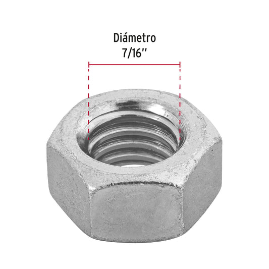 Proveedor:FieroBolsa con 60 tuercas 7/16' hexagonales de acero galvanizado Caja con 6, 44551Fabricadas en acero con recubrimiento galvanizado La medida corresponde al tamaño del tornillo que se acopla Permiten sujetar y fijar...