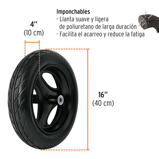 - Llanta imponchable suave y ligera de poliuretano con rin 3 aspas, brinda mejor amortiguamiento en terrenos irregulares y mayor estabilidad
