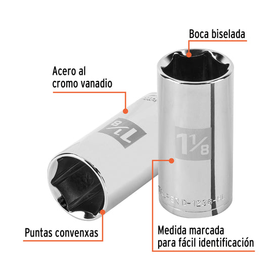 Dado largo de 1-1/8', 6 puntas, cuadro 1/2', Truper Caja con 6, 100998