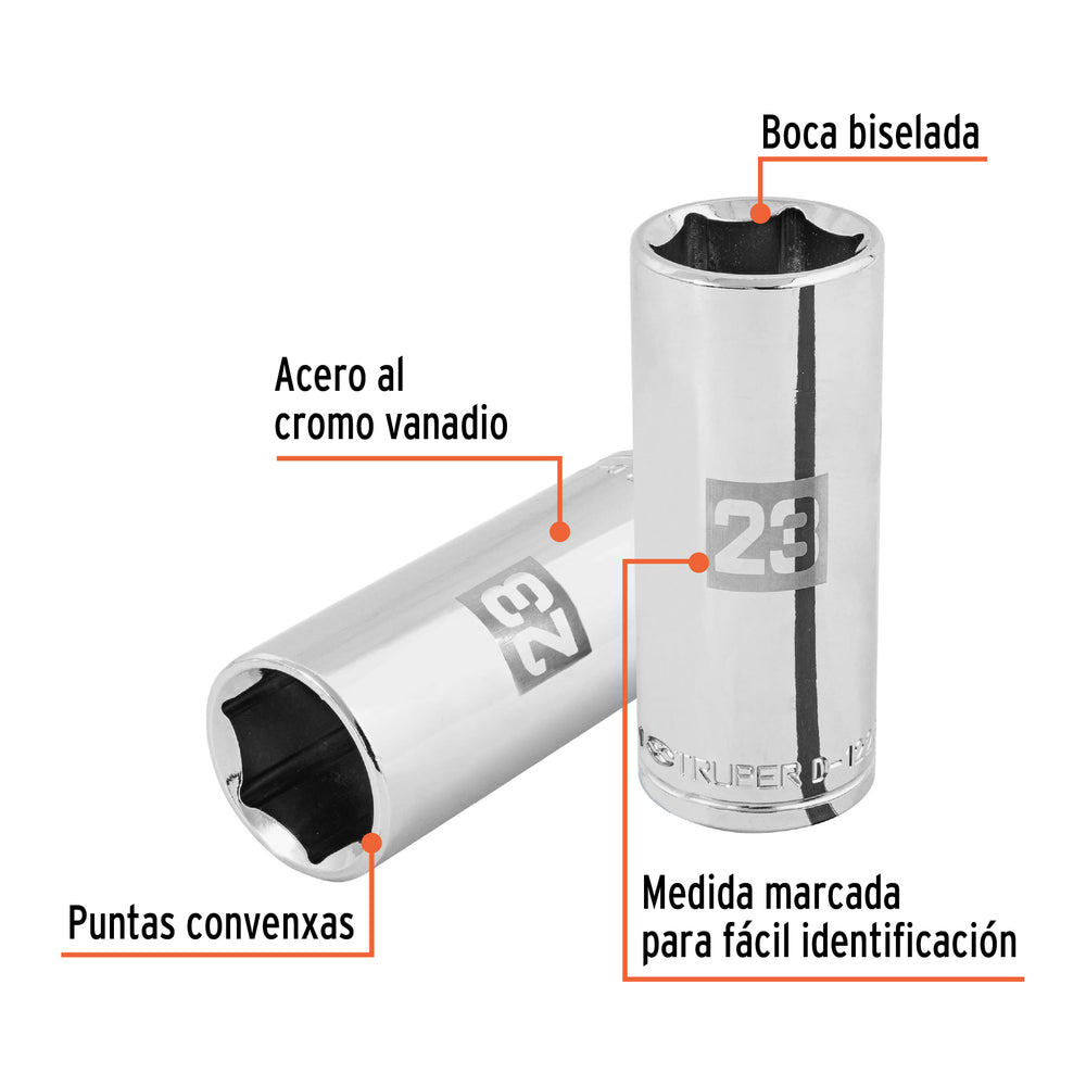 Dado largo de 23 mm, 6 puntas, cuadro 1/2', Truper Caja con 6, 101011