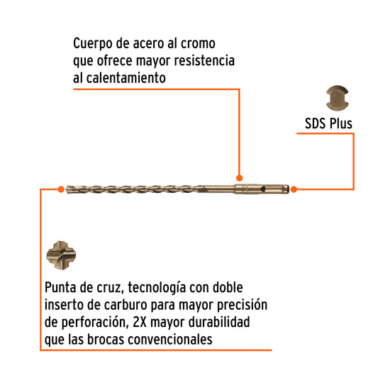 • Punta de cruz, tecnología con doble inserto de carburo para mayor precisión de perforación, 2X mayor durabilidad que las brocas convencionales