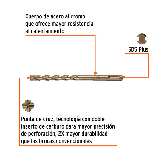 • Punta de cruz, tecnología con doble inserto de carburo para mayor precisión de perforación, 2X mayor durabilidad que las brocas convencionales