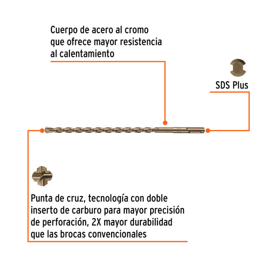 • Punta de cruz, tecnología con doble inserto de carburo para mayor precisión de perforación, 2X mayor durabilidad que las brocas convencionales