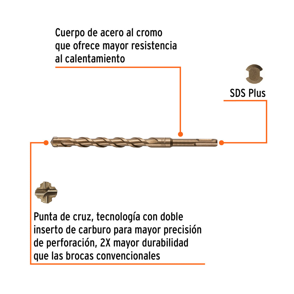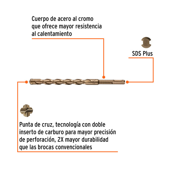 • Punta de cruz, tecnología con doble inserto de carburo para mayor precisión de perforación, 2X mayor durabilidad que las brocas convencionales