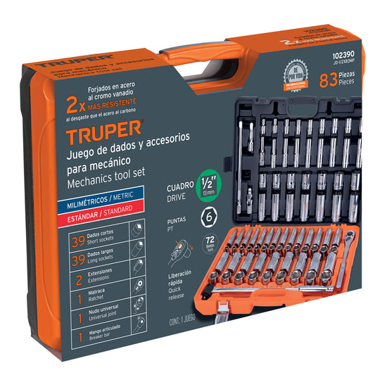 Juego de 83 herramientas cuadro 1/2' std y mm para mecánico, 102390