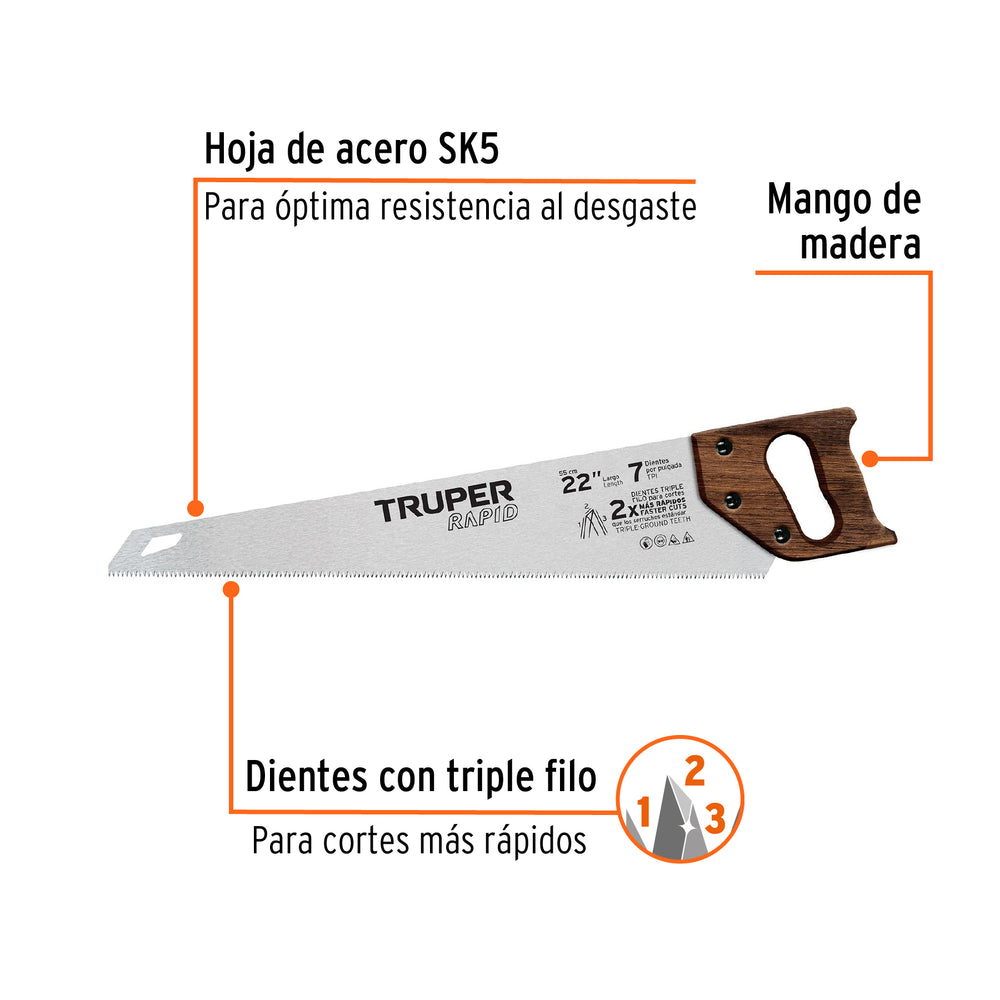 Serrucho Rapid 22', 7 DPP, mango de madera, Truper Caja con 3, 102952