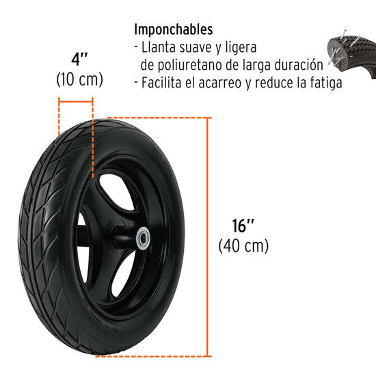 Llanta imponchable suave y ligera de poliuretano con rin 3 aspas, brinda mejor amortiguamiento en terrenos irregulares y mayor estabilidad