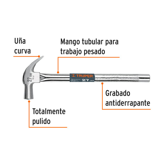 Martillo cabeza cónica 27 mm uña curva, mango tubular,TRUPER Caja con 4, 10914
